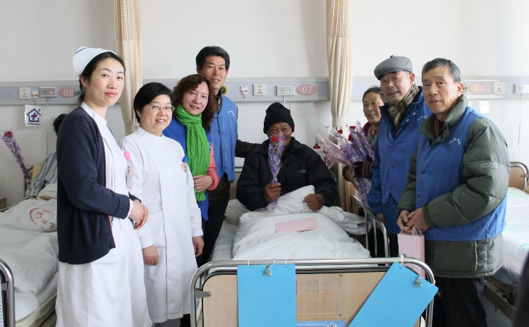 (图为杨晓霞与癌症协会志愿者探望肿瘤病人)