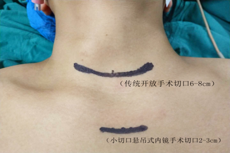 甲状腺肿瘤是一种临床常见病、多发病,其治疗手段以手术切除为主。常规甲状腺肿瘤切除术需在颈部切开一道约6—8cm的切口,由于术后瘢痕明显,往往影响美观。