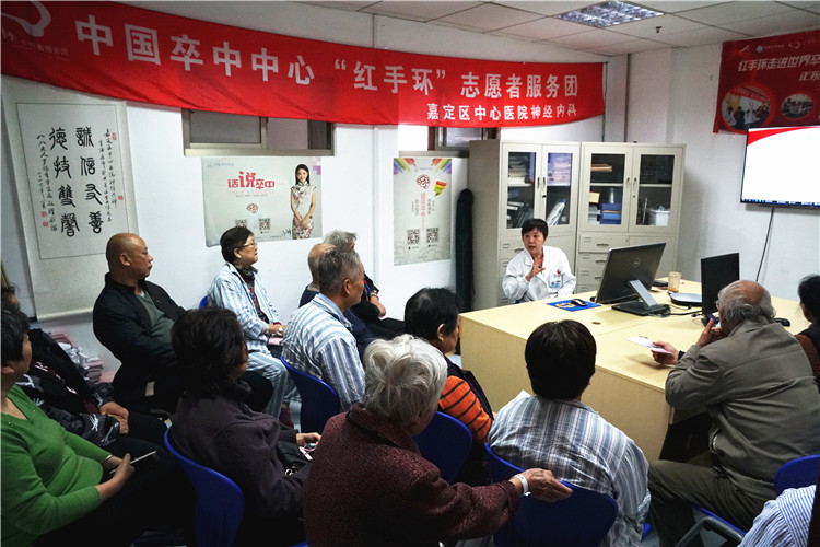 下午2点,神经内科病区会议室正在播放红手环视频,讲述嘉定红手环志愿者的成长历程,会议室被包围被水泄不通。随后,神经内科副主任医师曾虹玲以其风趣幽默、浅显易懂的表达,为住院患者带来了生动一课,现场气氛轻松而活跃。听罢讲课,护士陆维又给大家讲述了中风病人的常规护理,大家纷纷表示非常实用。