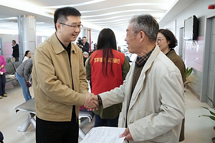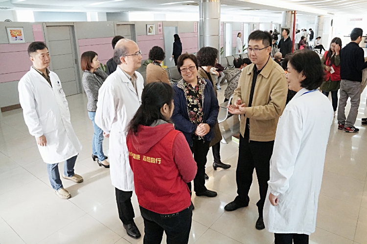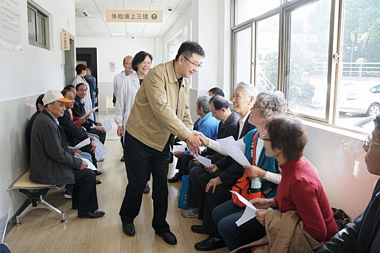 重阳节当天一大早,多名党员志愿者来到医院体检站,准备迎接即将来院体检的全区150余名老党员。8点左右,老党员们陆续到来。区委常委、组织部部长周文杰在区卫计委党委书记郑艳辉的陪同下亲临体检现场,向老党员们送上节日问候,并慰问了参加体检工作的全体医务人员和志愿者。