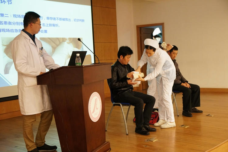本次培训着重进行了由我院和区精神卫生中心联合开展的“应急救援及心理危机干预”桌面推演。推演现场模拟了某商场失火发生踩踏事件,演练通过背景介绍、多种情景模拟及专家提问等形式,由区紧急医学救援队和区心理卫计干预队两组队员,分别对各自岗位职责、批量伤员的处置流程、医疗救治诊疗规范、如何开展心理危机干预等问题进行了回答和互动探讨。此外,现场还进行了心肺复苏、头部外伤、上肢骨折包扎技能操作。