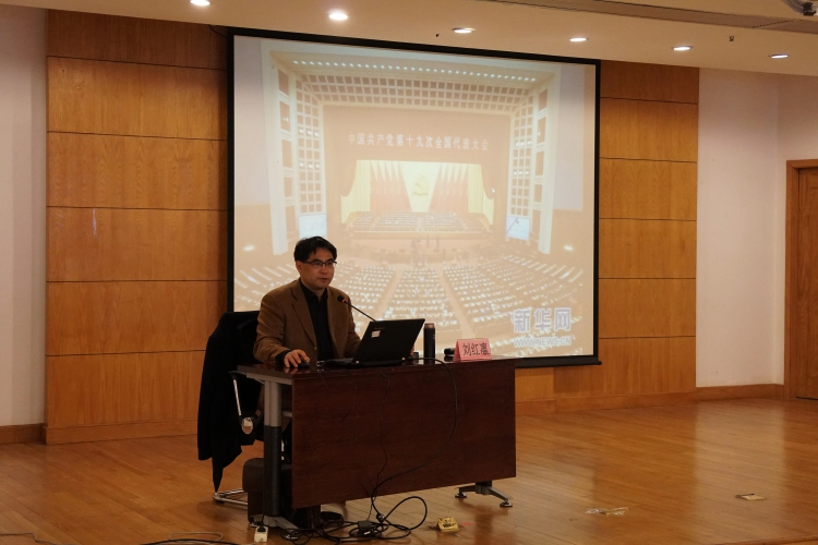 刘教授在宣讲时指出,党的十九大的主题是:不忘初心,牢记使命,高举中国特色社会主义伟大旗帜,决胜全面建成小康社会,夺取新时代中国特色社会主义伟大胜利,为实现中华民族伟大复兴的中国梦不懈奋斗。这一主题高度凝练、旗帜鲜明,深刻阐述了新时代中国共产党的历史使命,确定了新时代的奋斗目标和战略安排,对新时代推进中国特色社会主义伟大事业和党的建设新的伟大工程作出了全面部署。习近平总书记强调,不忘初心,方得始终。中国共产党人的初心和使命,就是为中国人民谋幸福,为中华民族谋复兴。这个初心和使命是激励中国共产党人不断前进的根本动力。十九大报告阐明的大会主题是我们党立足世情国情党情的新变化,立足我国发展新要求和人民新期待,是当前和今后一个时期党和国家工作提出的总要求,对我们党带领人民奋发图强、开拓前进具有十分重大的意义。