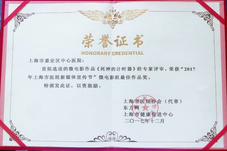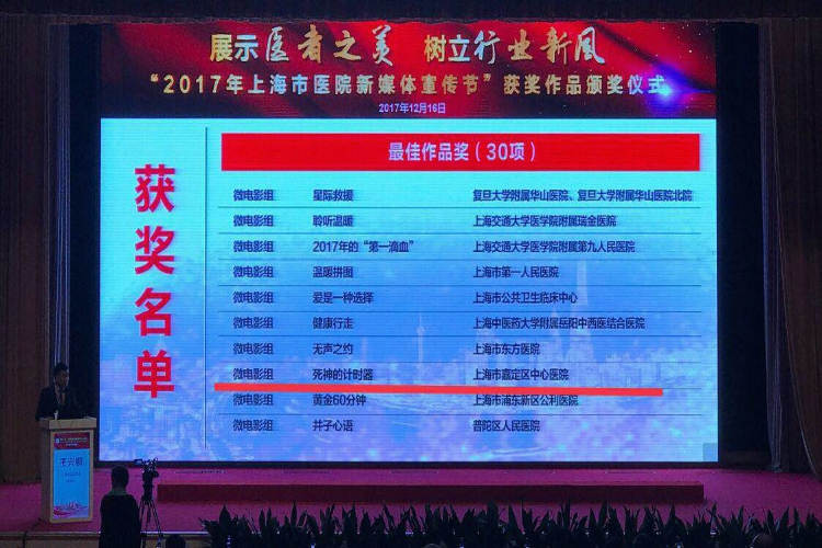 12月16日,在第十届上海市医院管理学术会议上传来喜讯,上海健康医学院附属嘉定区中心医院选送微电影作品《死神的计时器》,荣获“2017年上海市医院新媒体宣传节”微电影组最佳作品奖。