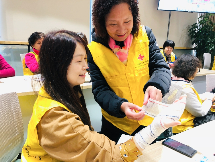 随后的红十字创伤救护专题培训中,螺旋反折、绷带八字法、帽式包扎、腹部包扎、膝盖包扎、绞紧止血,志愿者们认真听讲,两两组队练习,对不清楚的疑问也是争相提问。志愿者姚阿姨讲:“今天讲的包扎技能非常实用!我的小孙子前几天把手割伤了,血流不止,我心疼死了。要是早一点学会就不会那么慌了!”此次参观培训作为志愿者反哺系列活动之一,切实提高志愿者综合素质,进一步调动其积极能动性,更好地为患者、社会群体服务。