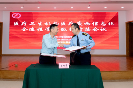 会上,市卫健委监督所所长卢伟和市固废处置公司总经理李传华共同签署了《医疗卫生机构医疗废物信息化全流程管理数据对接备忘录》。