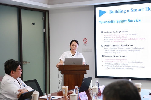 座谈会上,门急诊办公室黄惠就医院发展历程、学科布局与运营管理体系作专题汇报,系统展示了医院在临床服务、医学教育及科研创新等方面的综合实力与先进成果。