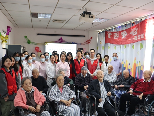 来自上海健康医学院的学生志愿者和医护人员们来到老年患者身边,通过诗词朗诵、书法展示、红歌献唱、游戏互动等环节,让这份重阳节的关怀,暖心又实在。